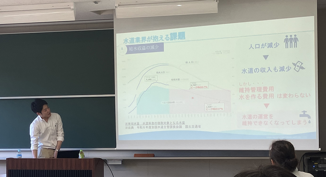 ホームトピックス佐賀大学で上水道に関する特別講義を実施しました お知らせ2025.09.04佐賀大学で上水道に関する特別講義を実施しました2025年7月28日、国立大学法人佐賀大学理工学部都市工学科の専門科目「環境衛生工学」の講義として、当社の社員が上水道に関する特別講義を行いました。講義では、「上水道のしくみとその実務」をテーマに、取水から配水に至るまでの上水道施設の概要や、近年の水道事業が抱える課題とこれからの取り組みについての解説と、上下水道コンサルタントの実務について当社の業務事例を交えた説明を行いました。今後も、上下水道の現状と重要性についての理解を得られるよう、様々なかたちで取り組んでまいります。